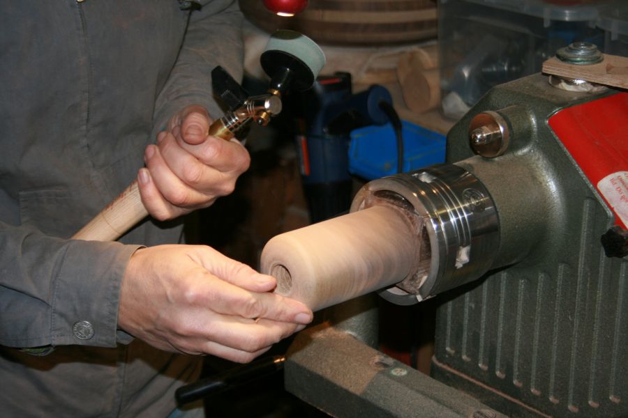 Unser „Maschinenpark“ ist inzwischen beachtlich gewachsen – neben zwei Drechselbänken mit scharfem Werkzeug sind u.a. Bandsäge, Schärfsation und Absauganlage für angenehmes und sicheres Arbeiten unentbehrlich. Aus Platzgründen sind die meisten Geräte in kleinerem Maßstab vorhanden als in einer Profi-Werkstatt – jedoch von guter Qualität.